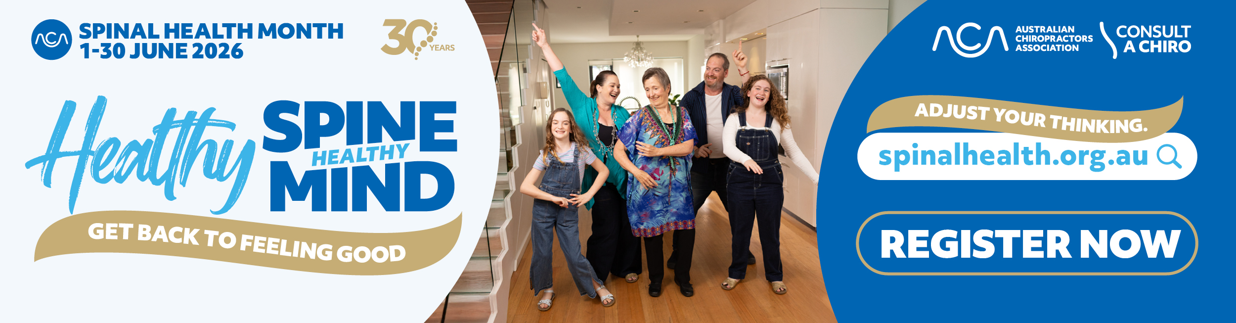 National Spinal Health Month (1 -30 June 2026) is the flagship initiative of the Australian Chiropractors Association (ACA). For 30 years, ACA’s annual community health initiative has shone a spotlight on spinal health issues that affect millions of Australians while encouraging individuals and communities across our nation to take proactive steps to improve spinal health.